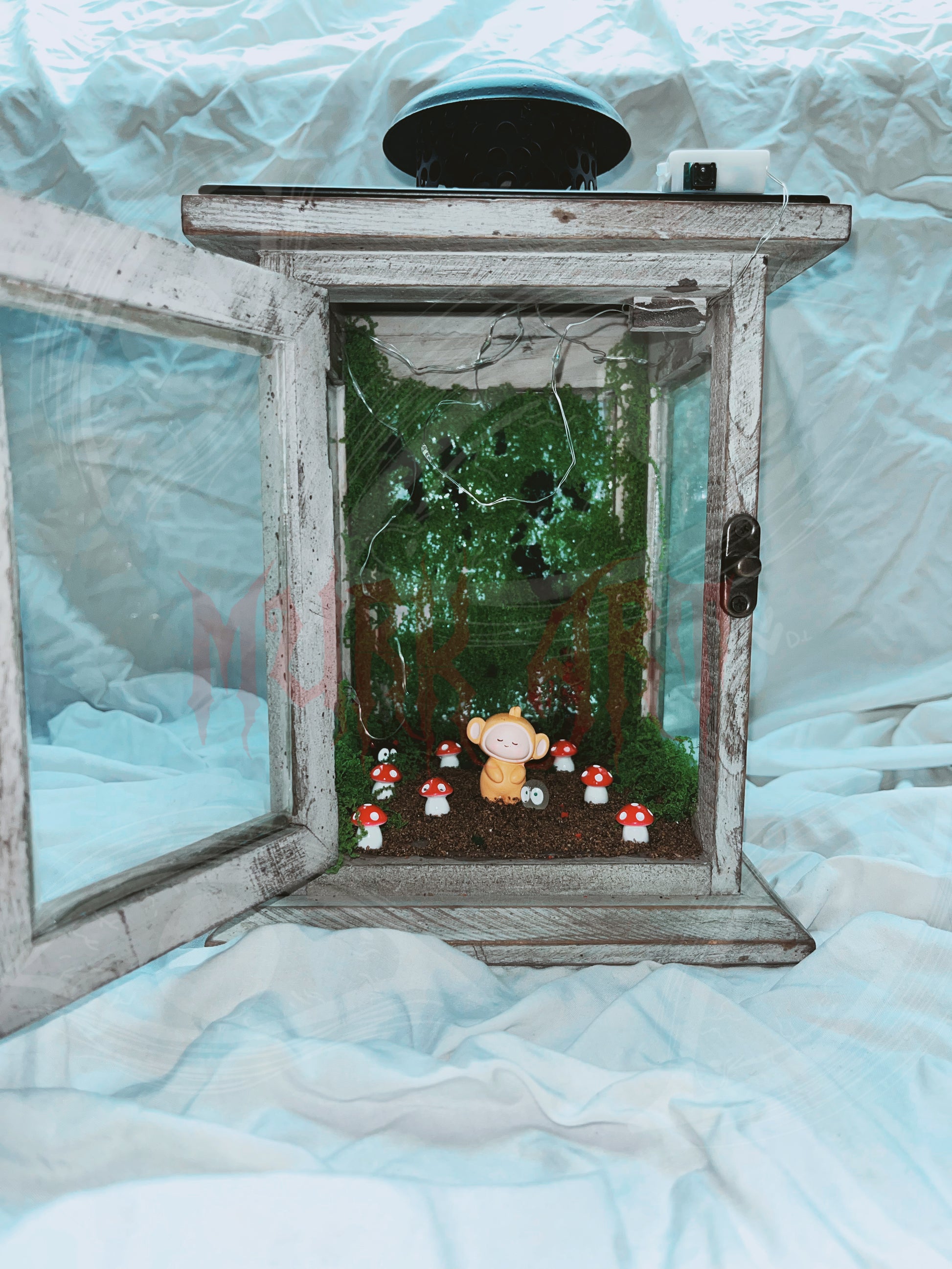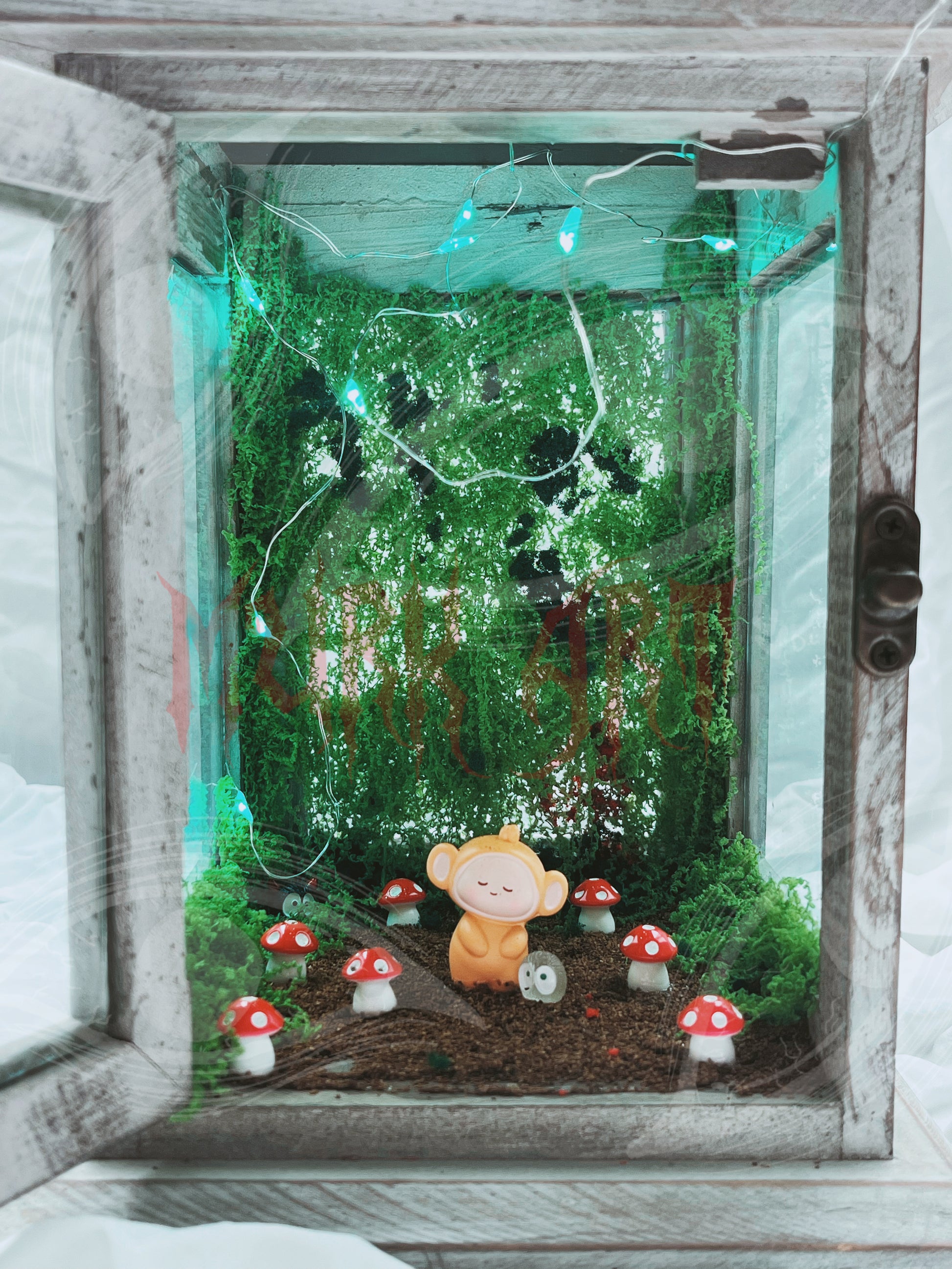 Petit être vivant dans sa forêt , se dirigea vers un chemin mystérieux… hélas il se rendit compte qu’actuellement il est coincé dans une grande boîte géante entourer de ses amis les champignons et ses p’tit fantômes, cela le rendis heureux/se