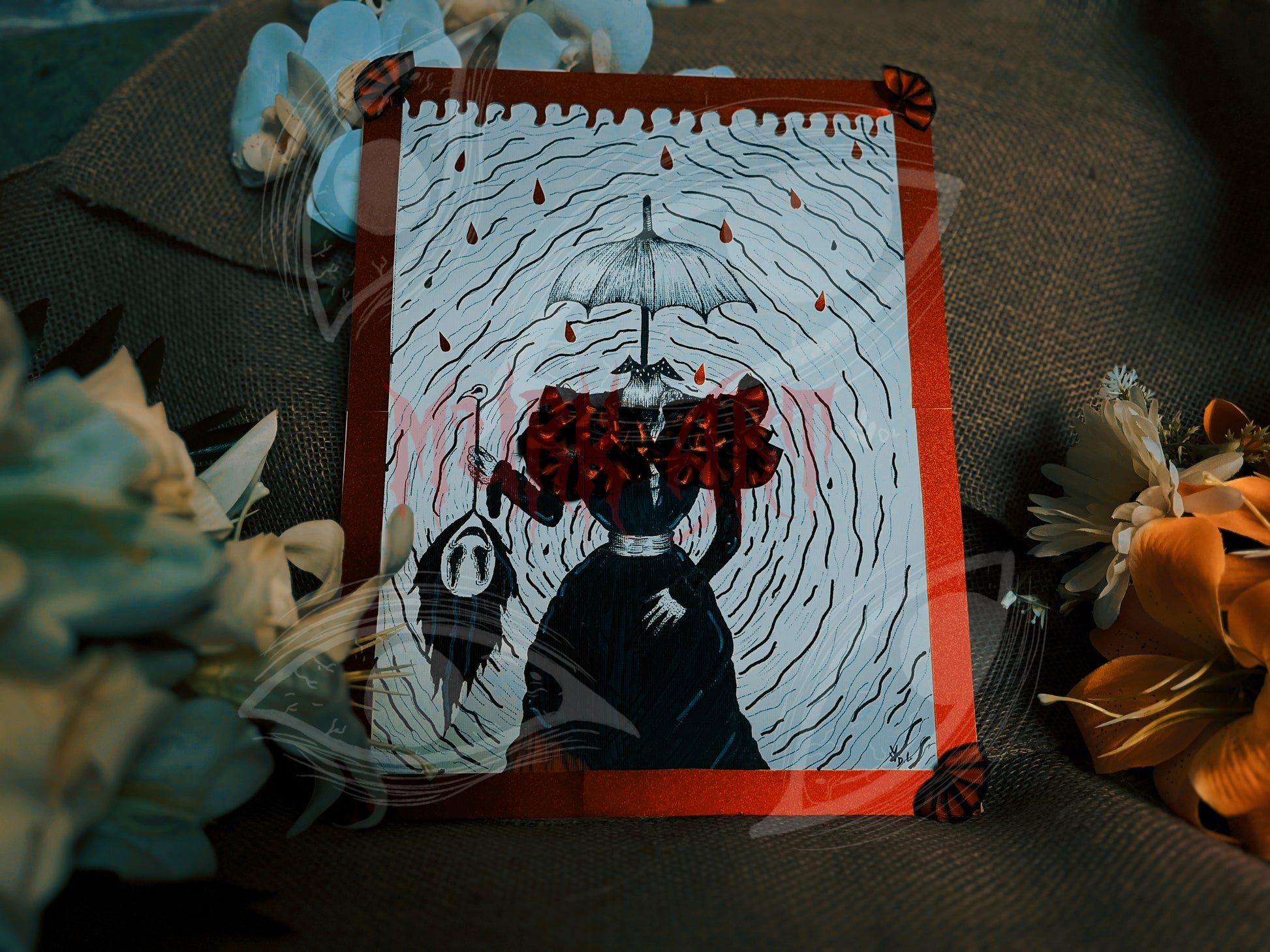 Rainblood est une superbe pièce en toile UNIQUE faite à la main, avec un feutre liner 0.3mm et des feutres à alcool noir, rouge, orange et rouge foncé. Cette composition unique comporte également des rubans de tissus, de la colle et des feuilles cartonnées pailletées, offrant un aspect artistique et original à n'importe quel espace. Cette toile représente une femme au visage d'un parapluie, symbolisant la force et la protection face à la pluie de sang qui a endommagé son visage. Une œuvre captivante et émotionnelle qui saura susciter l'intérêt dans votre interieur !