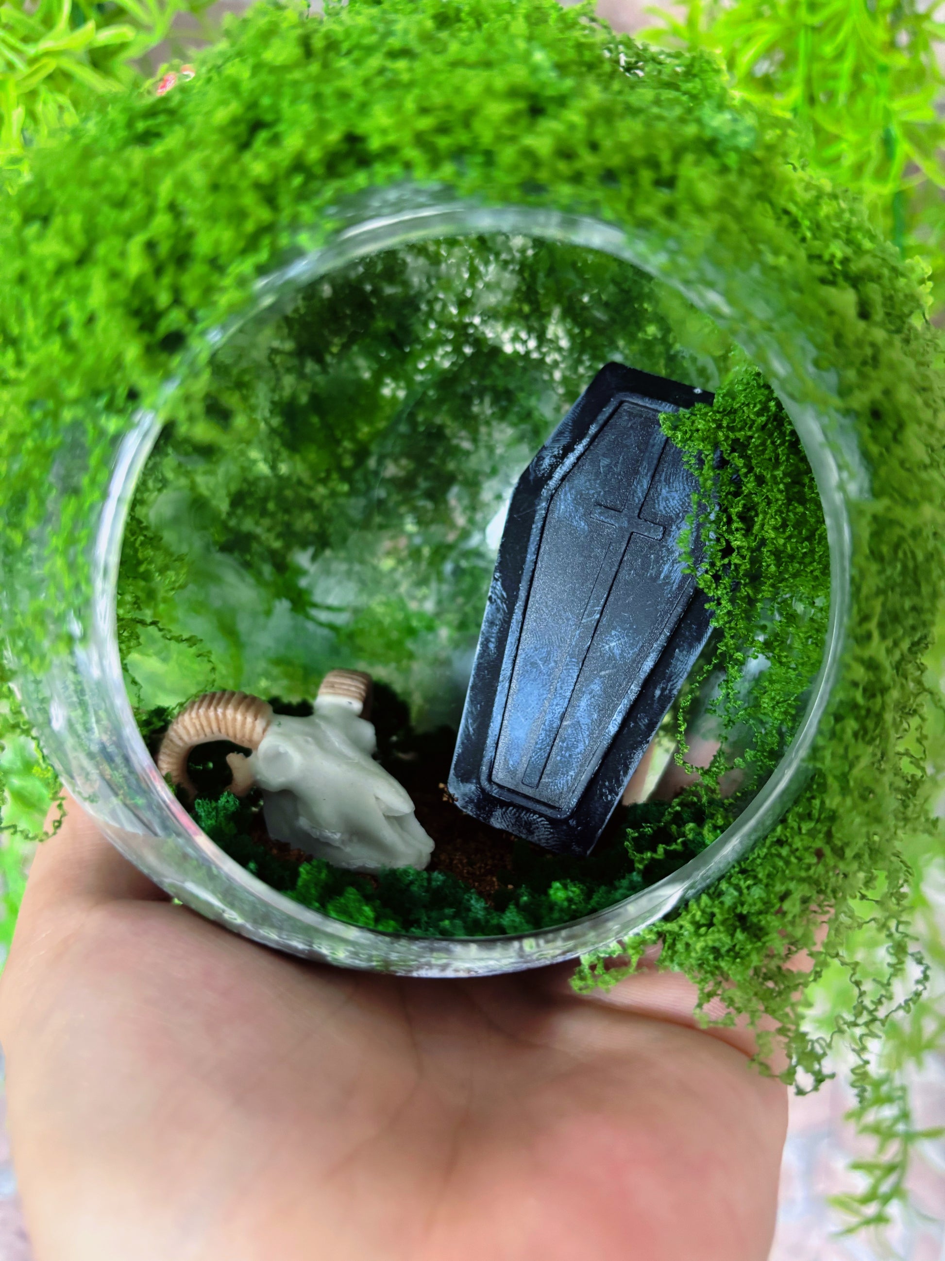 Création dans une bulle en verre, remplis de fausse verdure, champignon en figurine, cercueil, faux crâne, fausse terre, colle