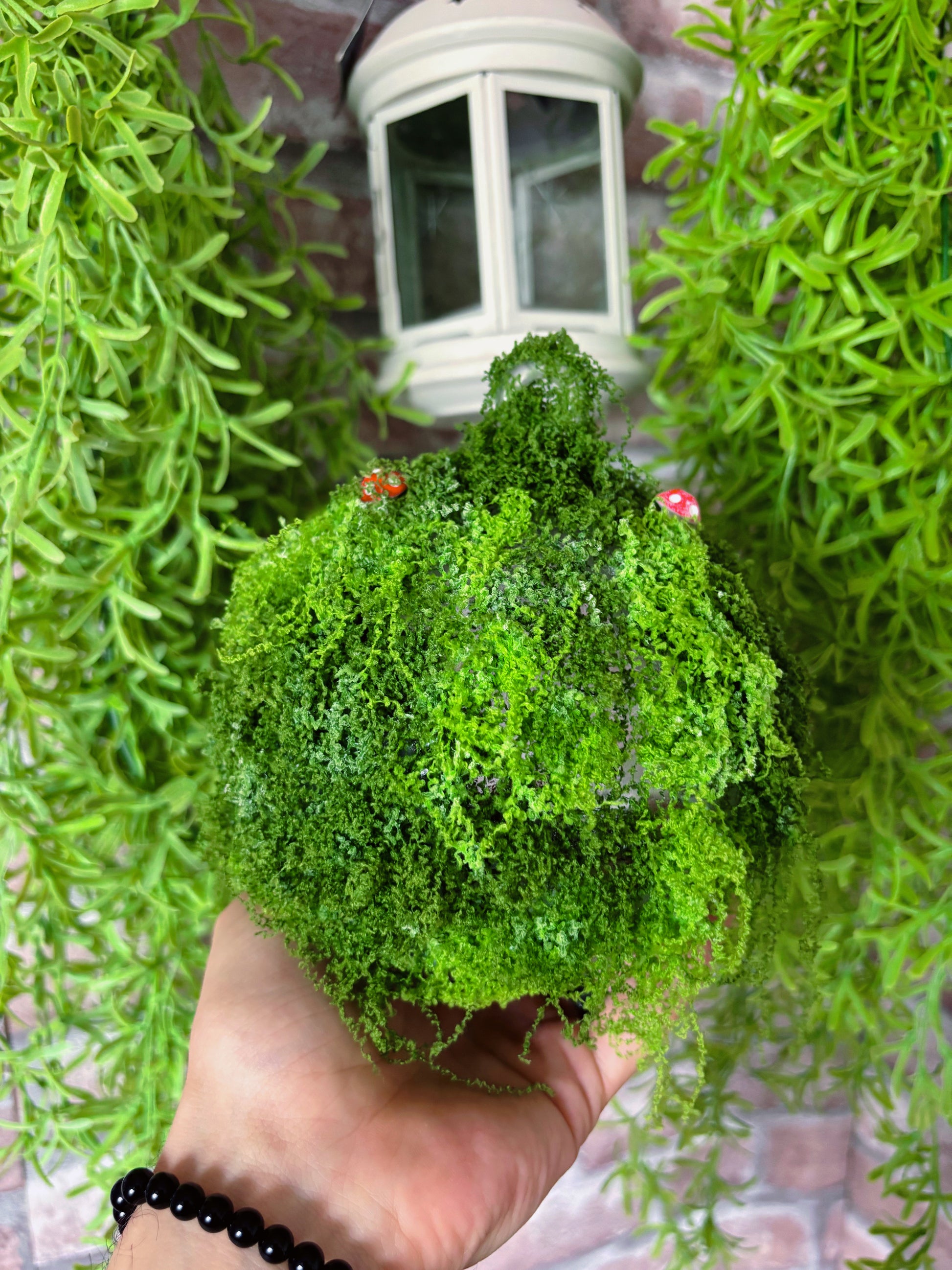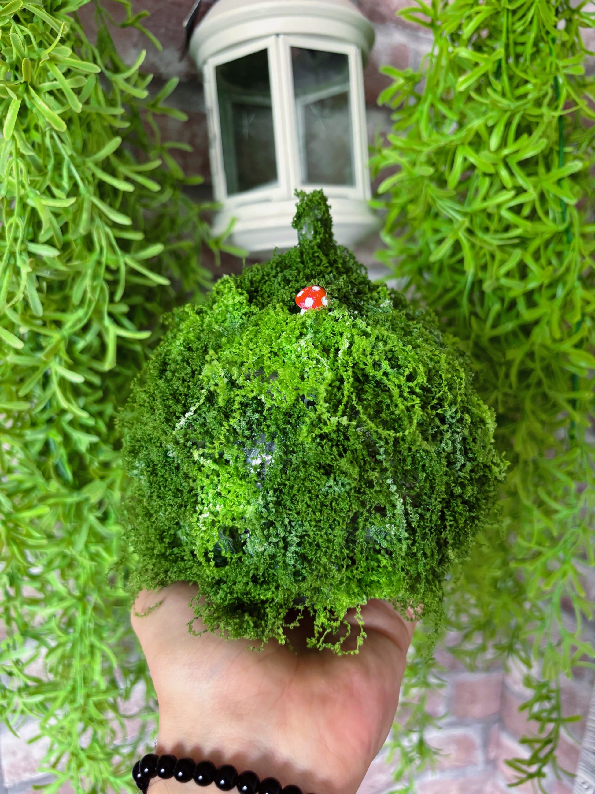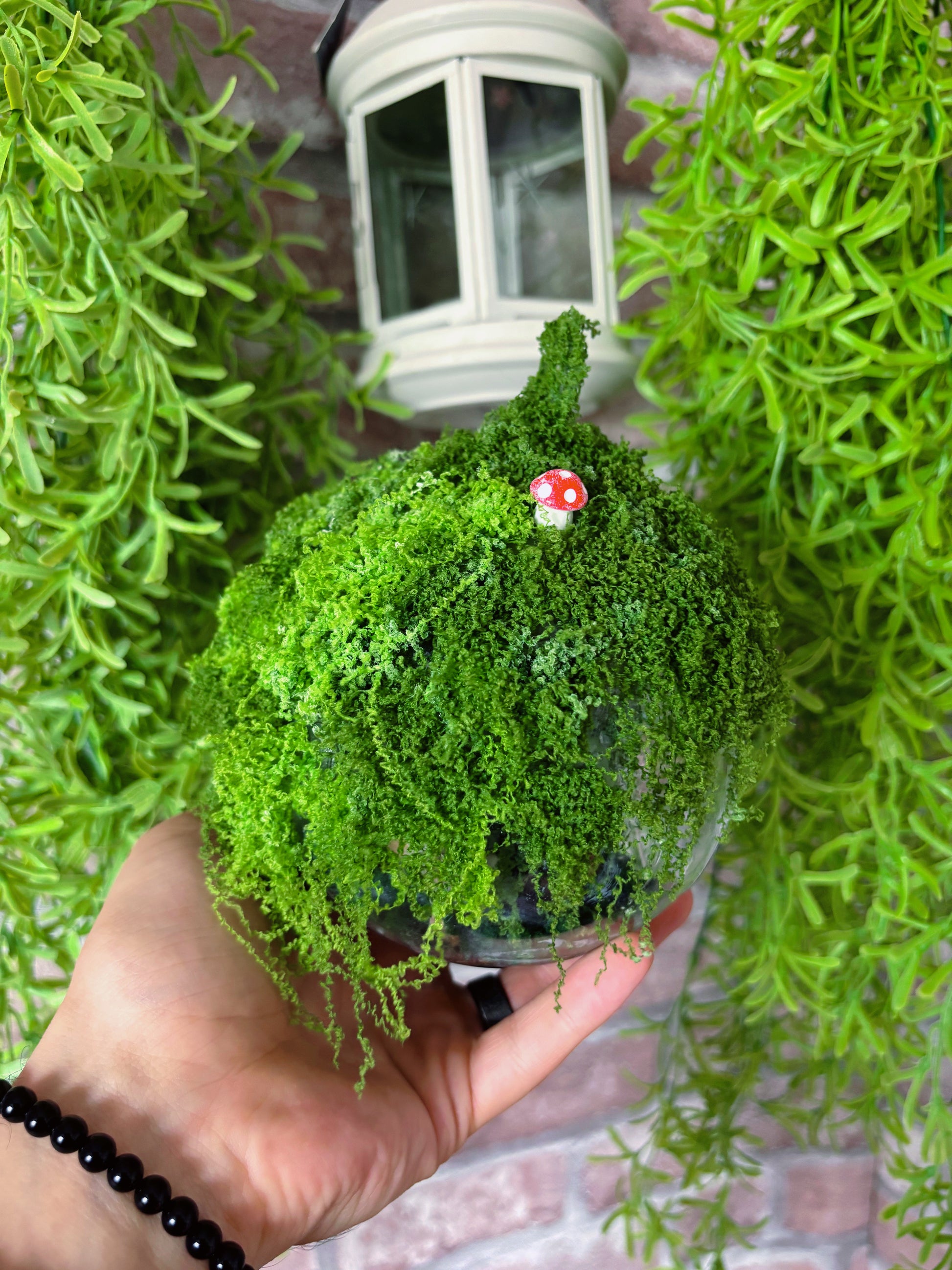 Petite sphère décorative d’intérieur : la mort se reposant dans une verdure verdoyante. Comme si tout n’était que renaissance.
