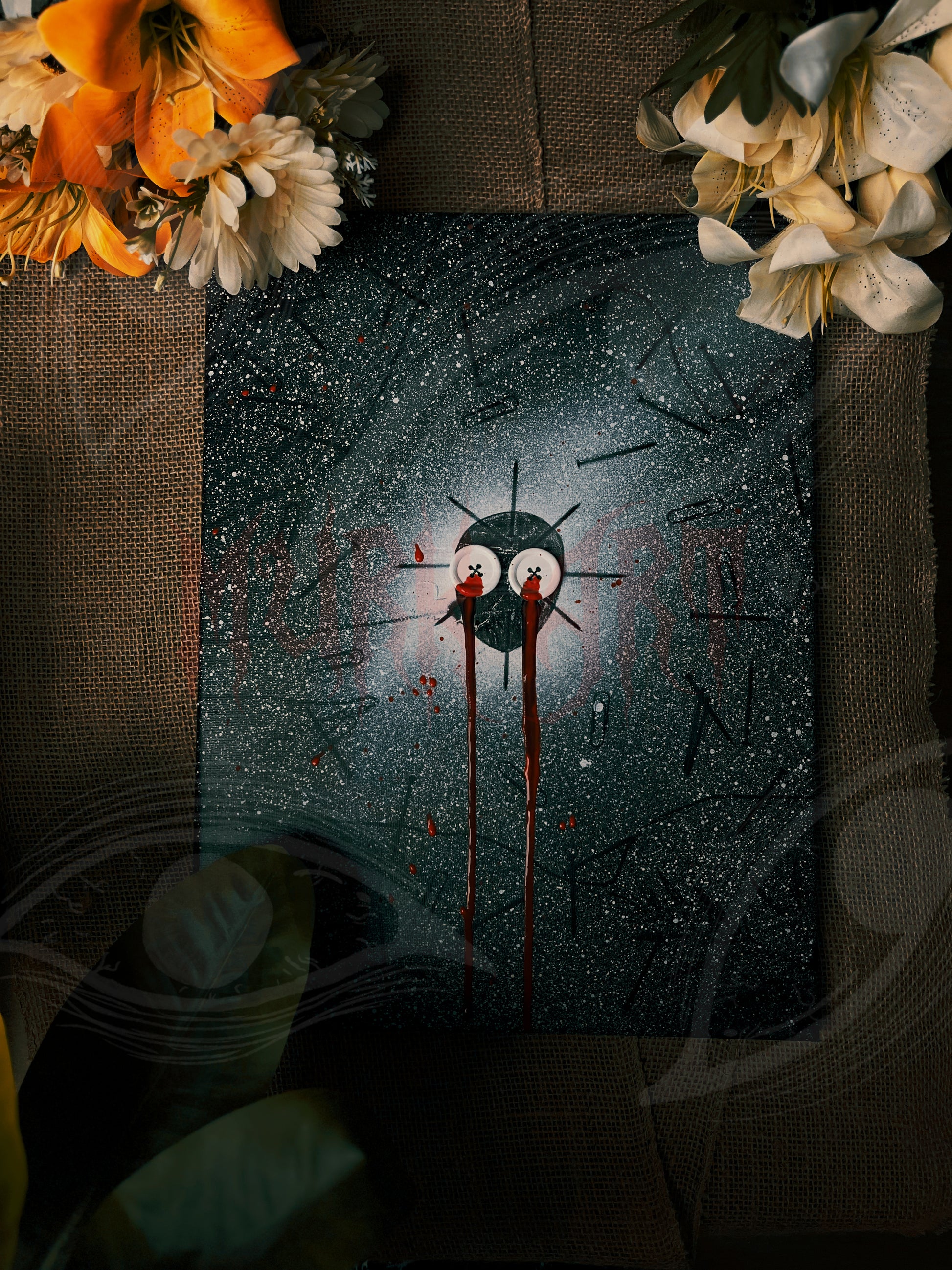 Découvrez la beauté unique de VISAGE MEURTRI. M sur une toile de 30x40cm, cette pièce présente une peinture en aérosol noire et blanche frappante et des touches de rouge avec des boutons cousus à la main. Embrassez la passion et l'émotion brute de cette œuvre d'art unique en son genre